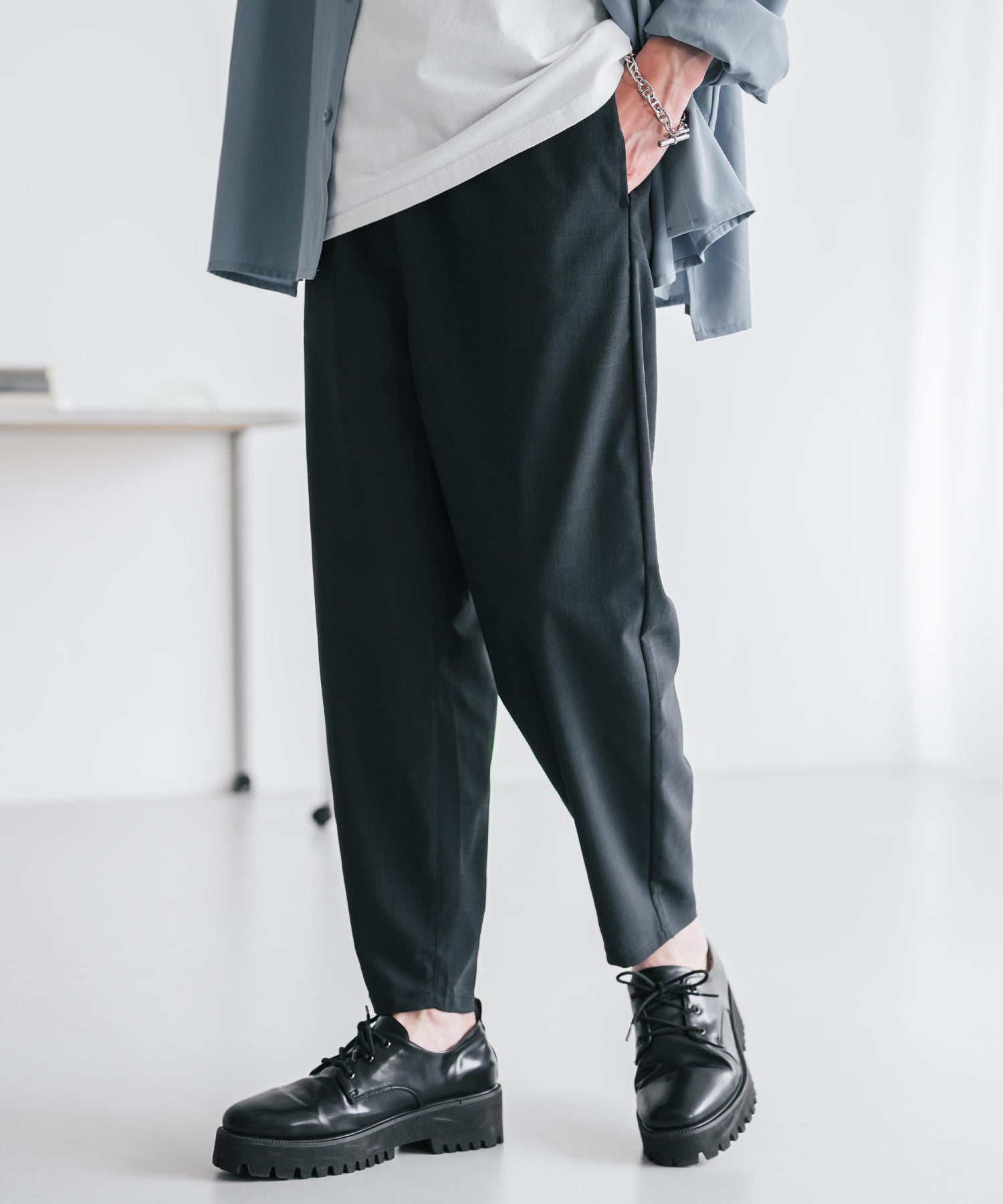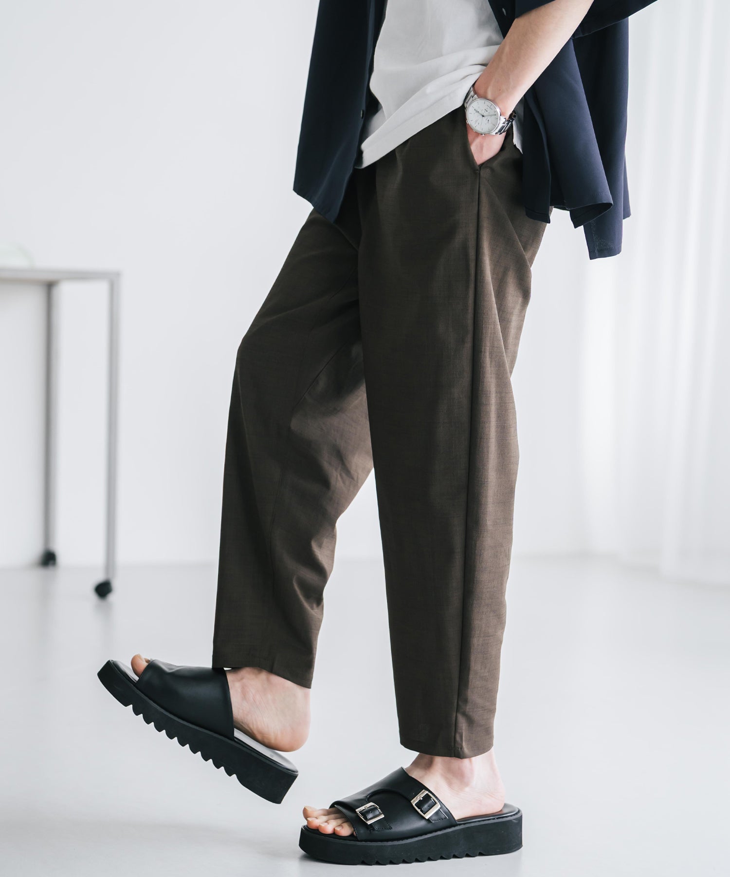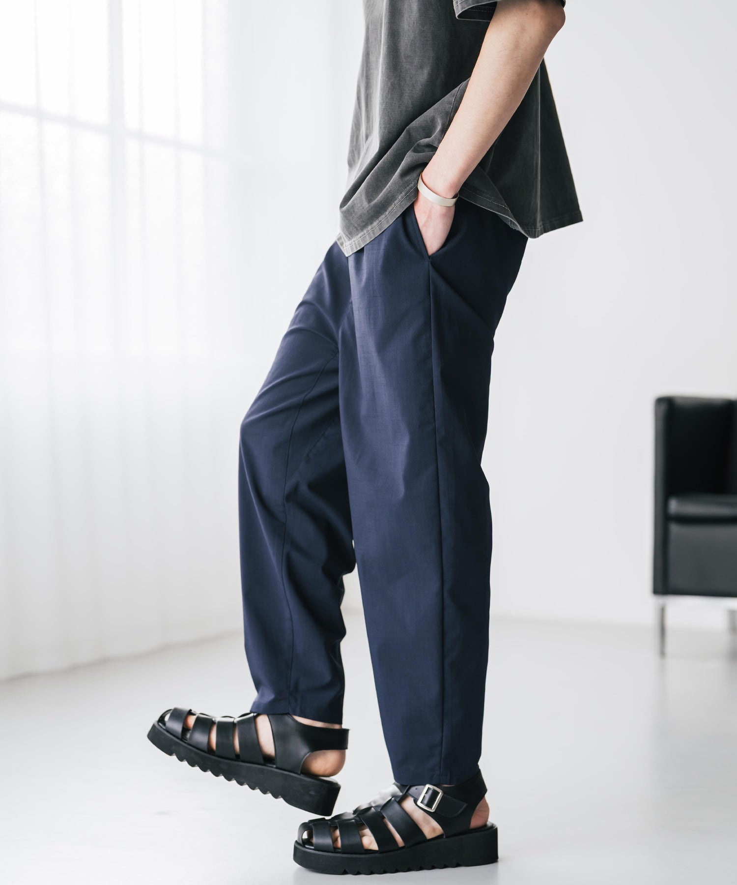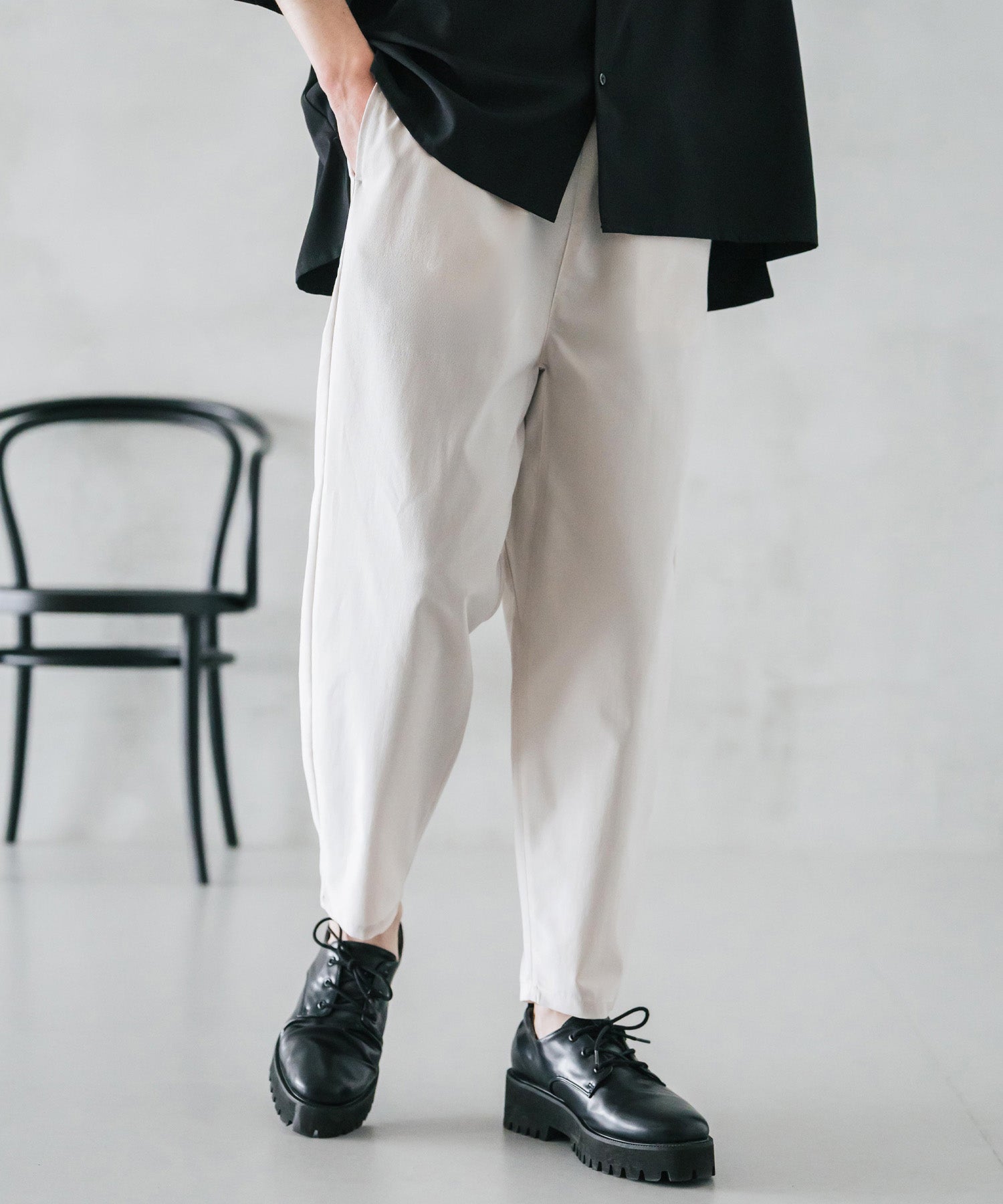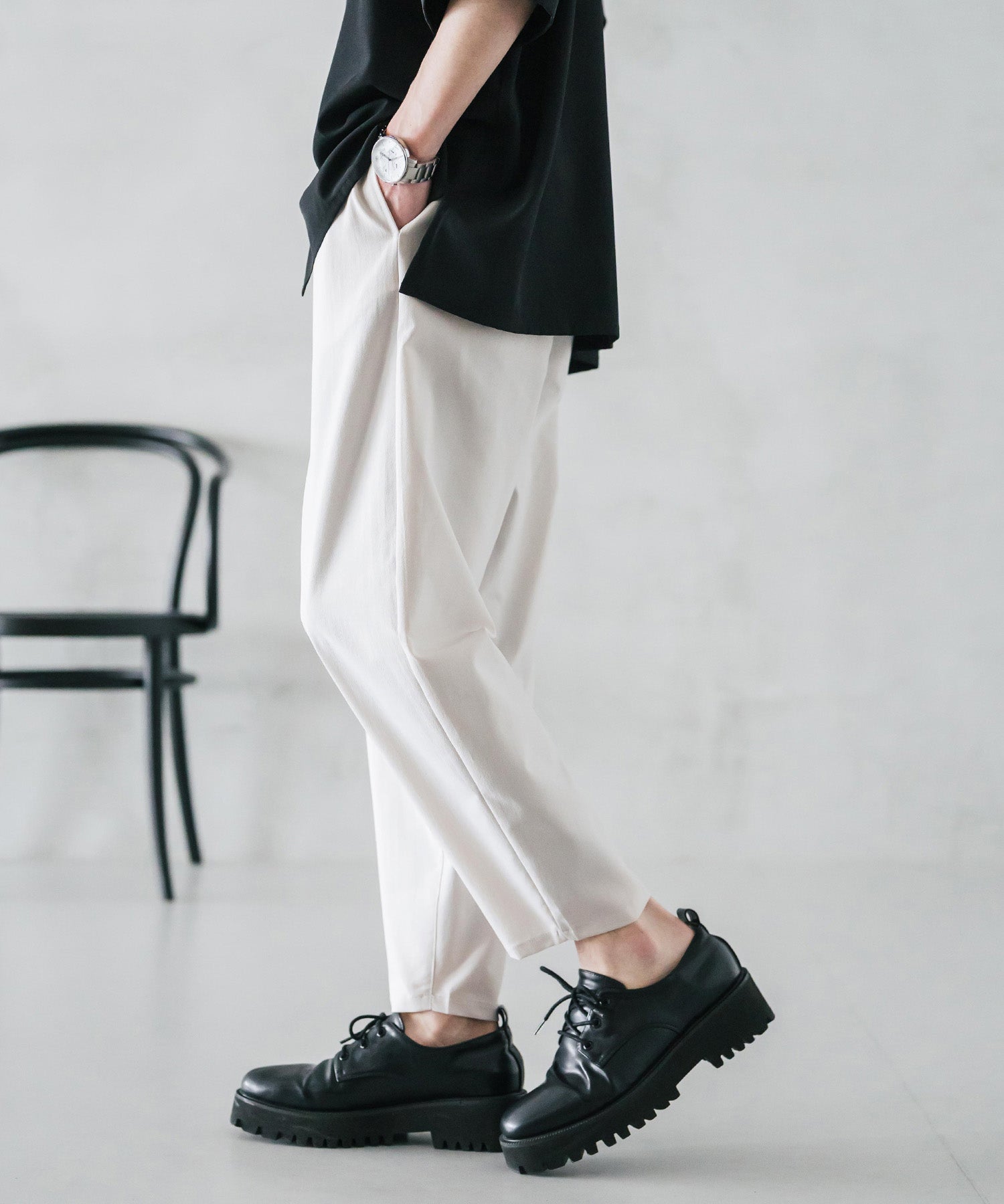 膝から下は裾に向かってテーパードを効かせたシルエット。