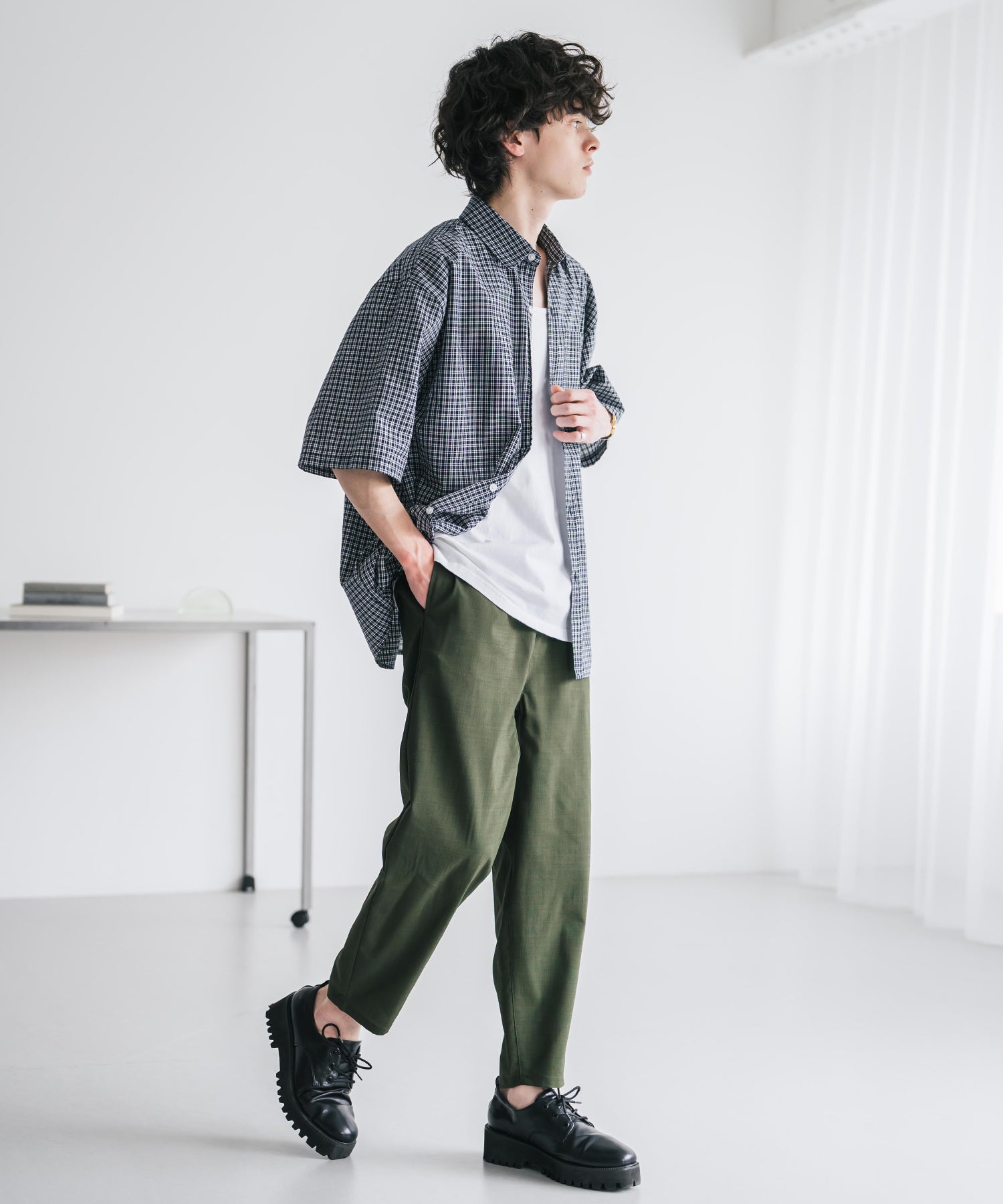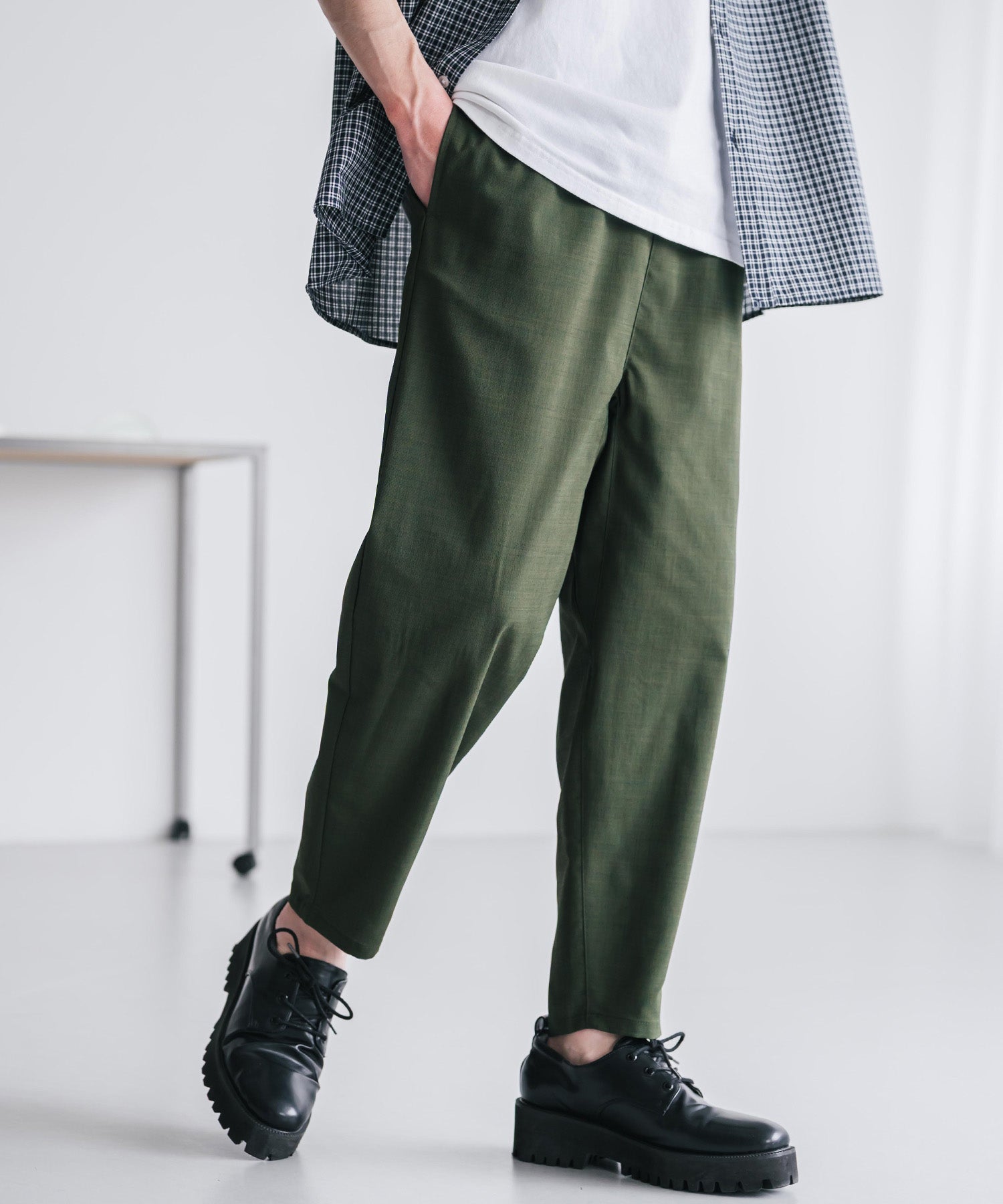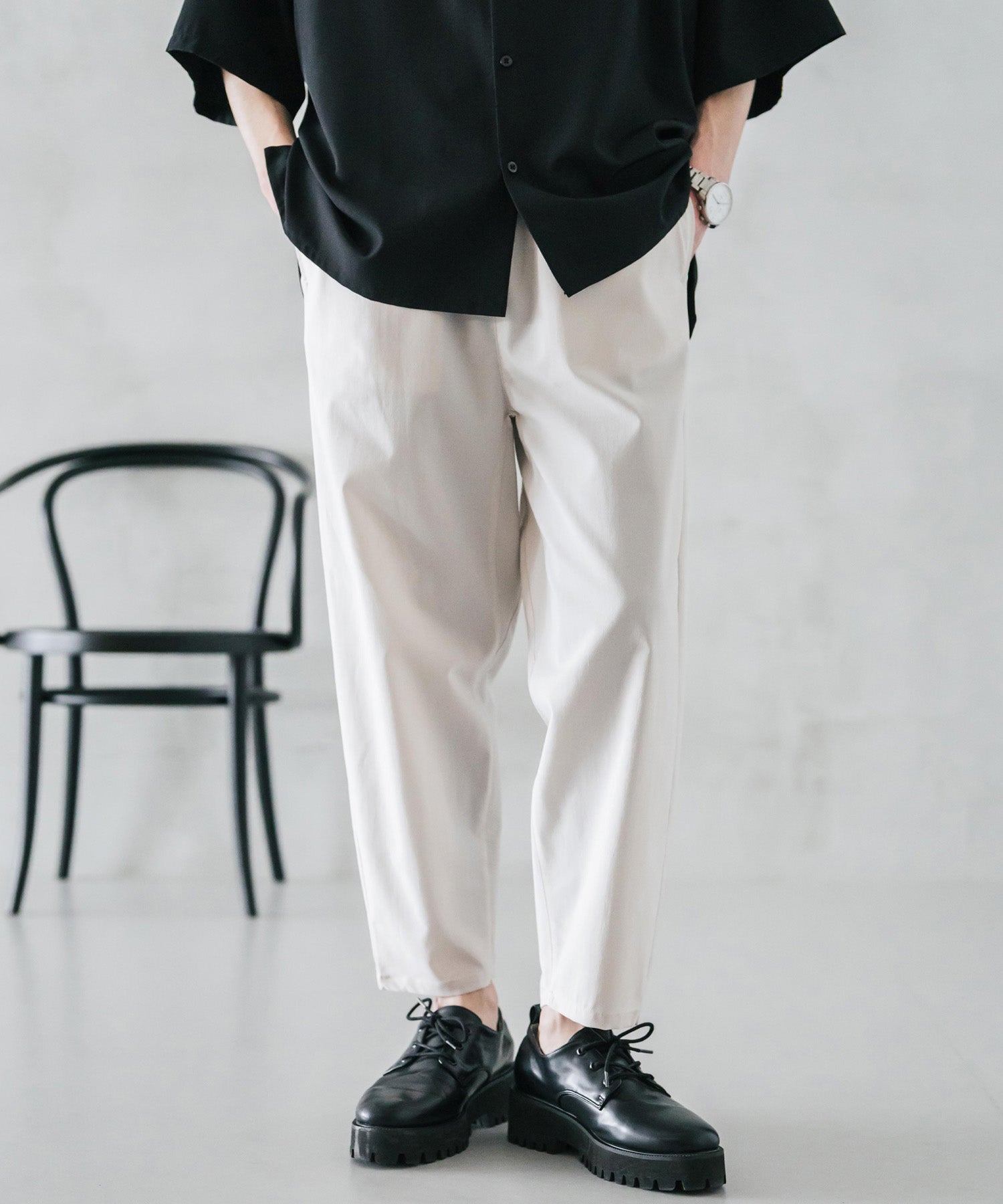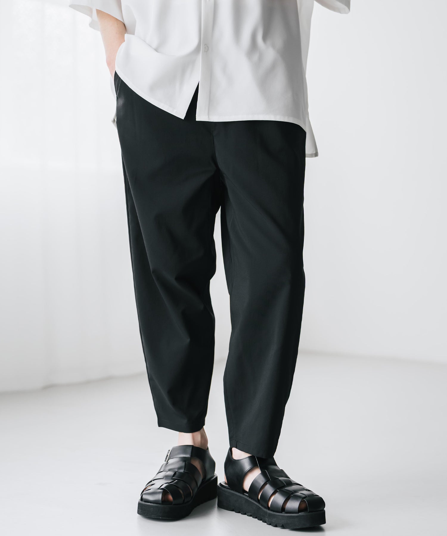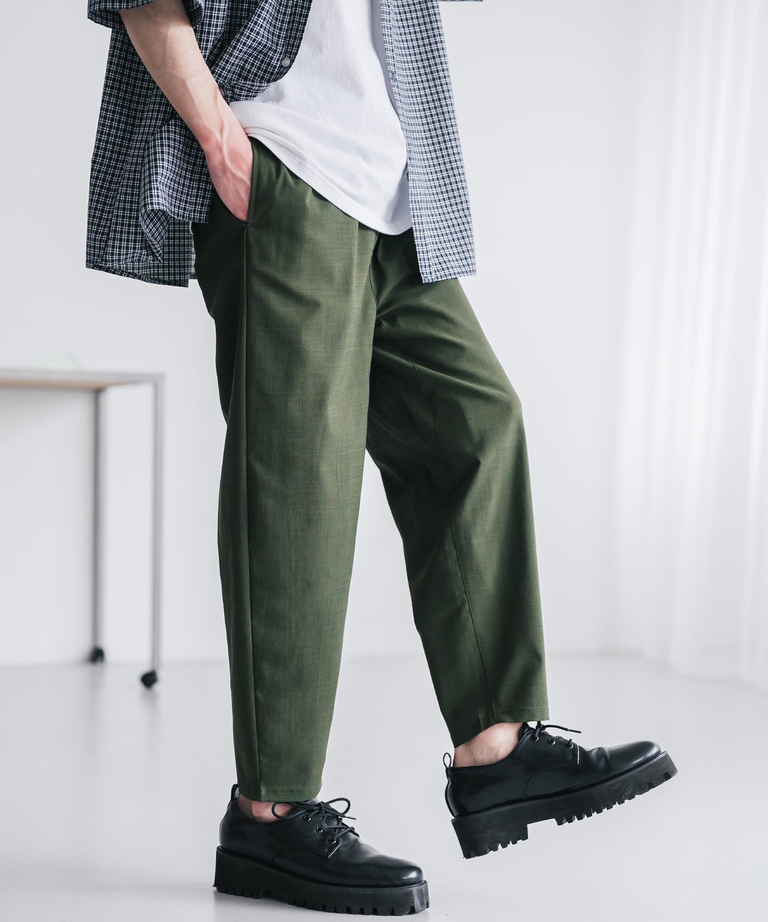 膝から下は裾に向かってテーパードを効かせたシルエット。