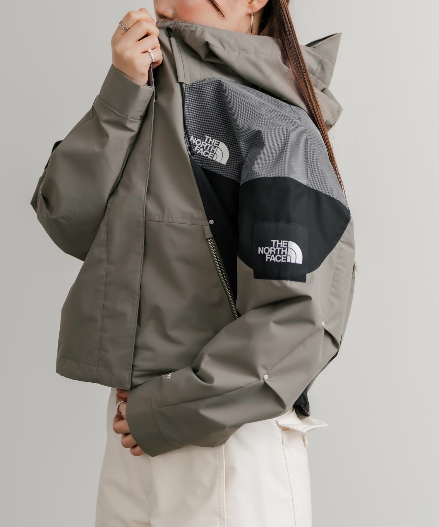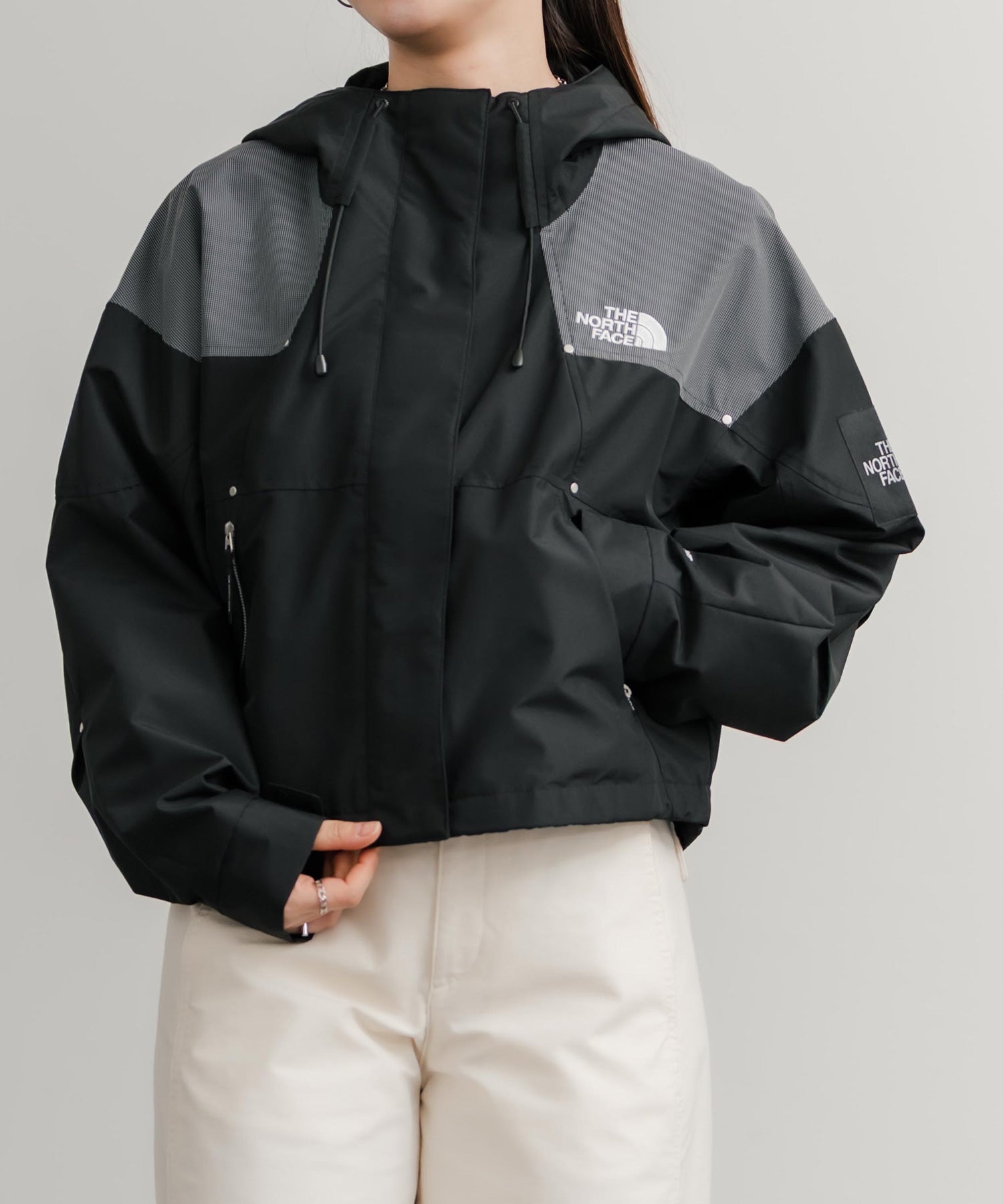 ブロックカラーが特徴的なショート丈のマウンテンパーカー。