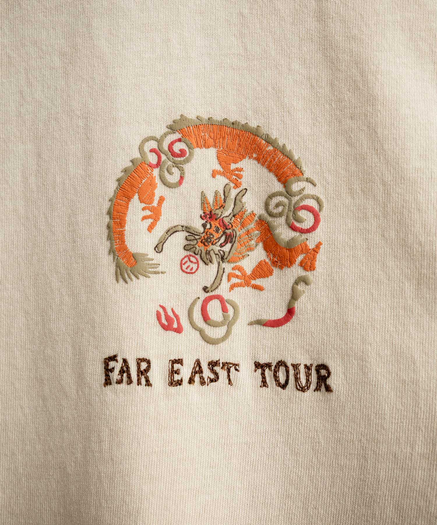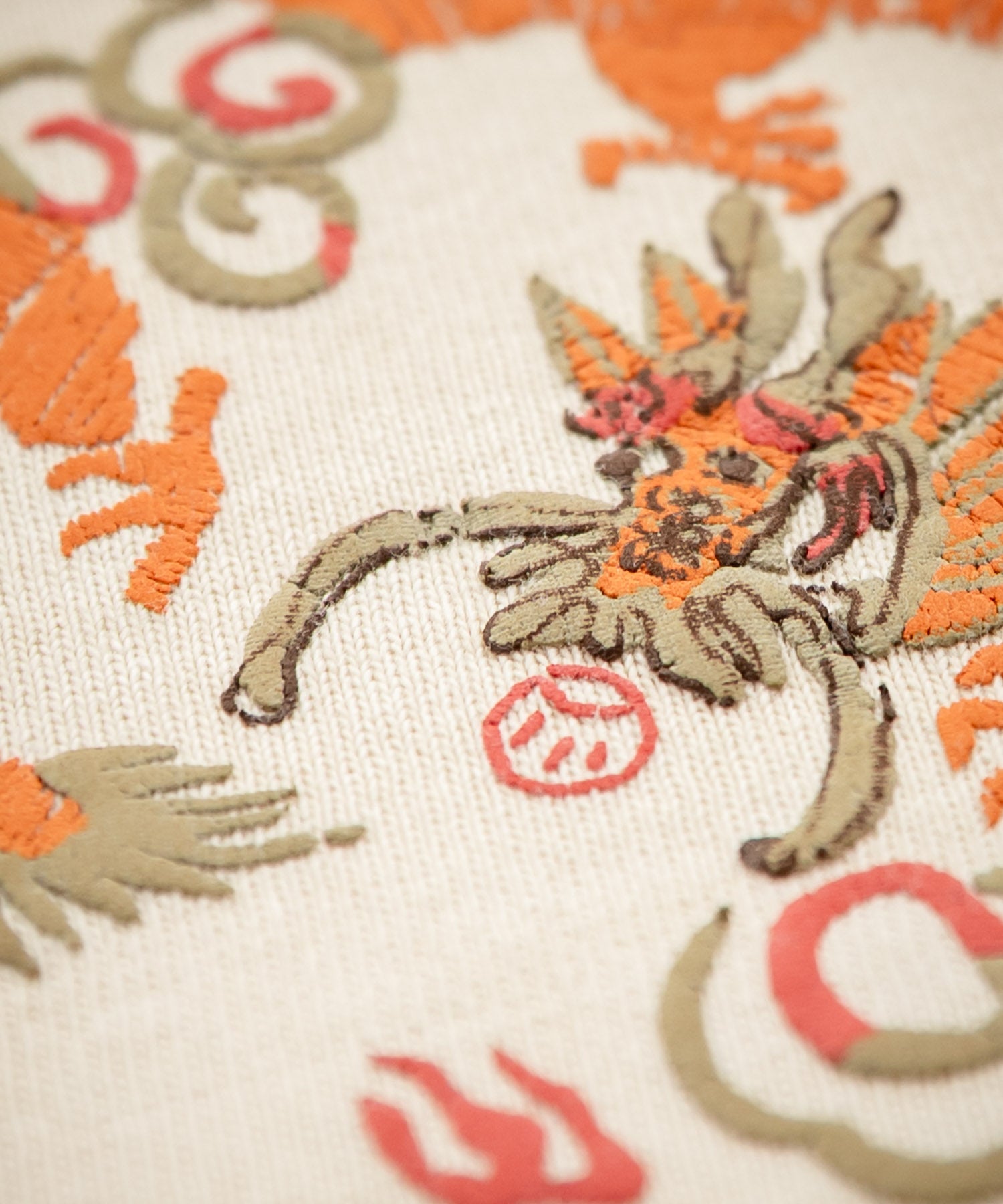 刺繍でデザインしたような立体感のあるドラゴンをプリントで表現したTシャツ。
